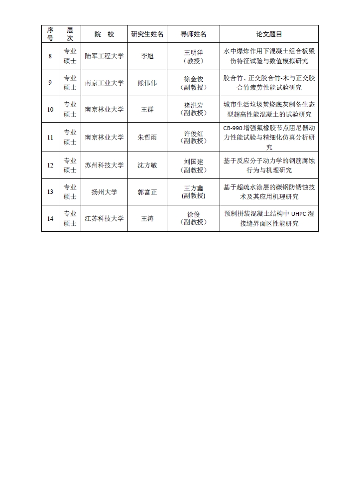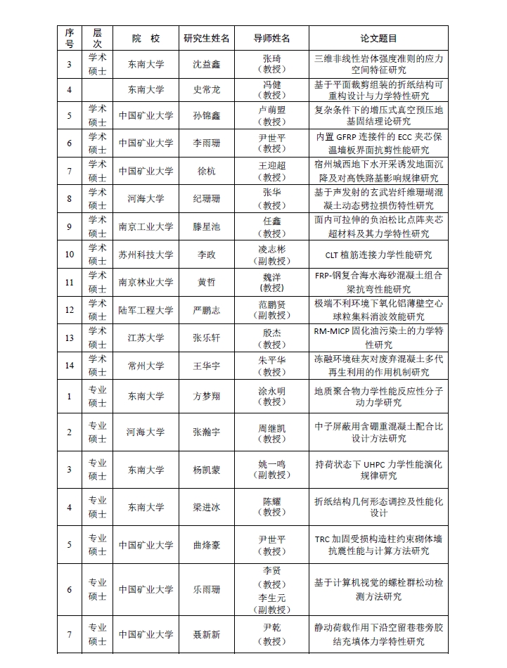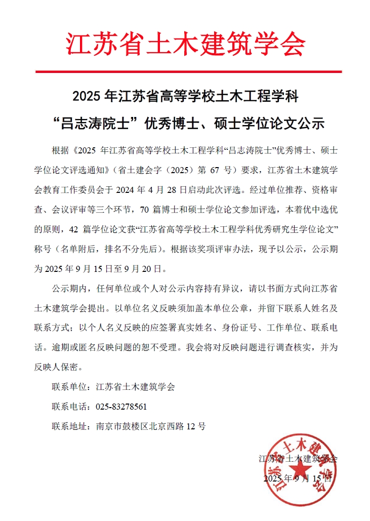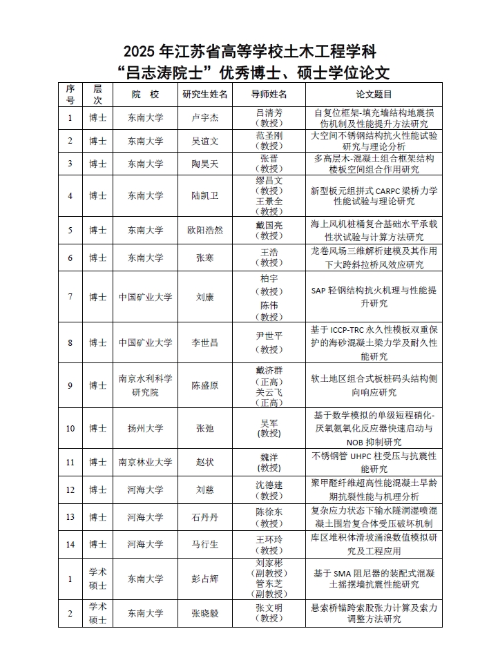 2025年江苏省高等学校土木工程学科“吕志涛院士”优秀博士、硕士学位论文公示