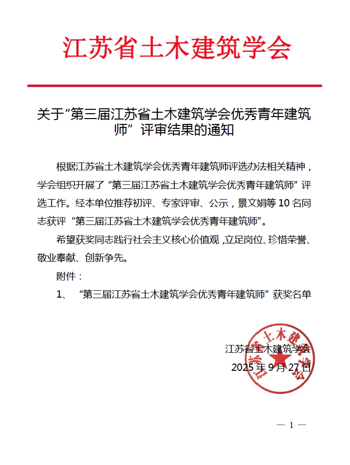 关于“第三届江苏省土木建筑学会优秀青年建筑师”评审结果的通知